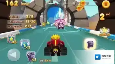 2、赛道上,控赛车(3rd),吃加速道具,超粉色/黑色对手,追金币。