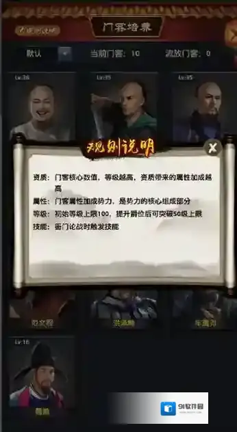 2、每个门客都是拥有自己擅长的领域,并且所有的门客属性都是进行叠加的。拥有的门客数量越多并且等级越高玩家的实力也会越高!