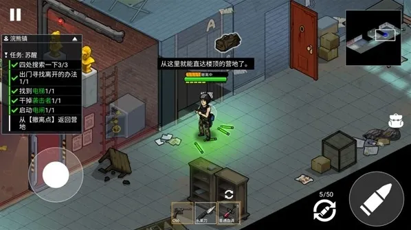 3、进入关卡后左边控制角色的移动,右边是换弹、射击和背包按钮,屏幕下方的是你的武器和治疗道具,右上角的是关卡地图,左上方的是你的任务。