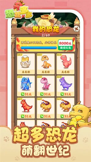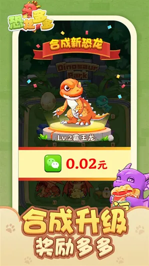 3、游戏以合成进化为核心乐趣,相同恐龙拖拽即可完成升级,逐步解锁稀有品种与高阶形态,搭配五福龙收集目标,持续激发玩家的探索欲与收集动力。
