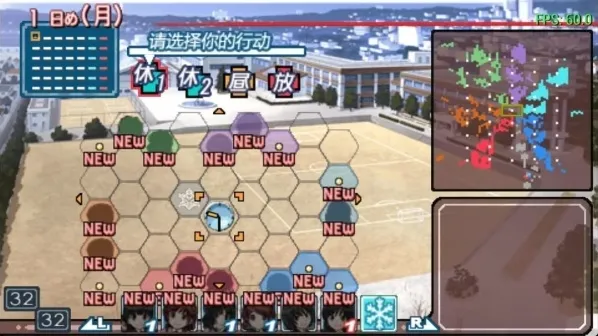 4、在校园地图中,使用六边形格子进行移动与行动选择,点击“NEW”区域触发事件,提升与角色的亲密度。