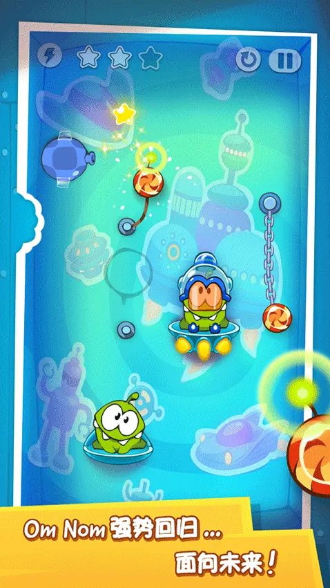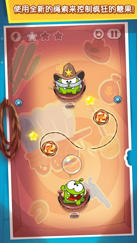 割绳子时光旅行是由ZeptoLab开发的割绳子系列经典续作。游戏延续了系列核心的物理切割玩法,同时加入了全新的“双人同喂”机制和时代特色道具。玩家通过手指滑动屏幕割断绳子,让糖果落入小怪兽Om Nom的口中。与之前作品最大的不同是——每一关都有两只小怪兽等待进食,你必须同时喂饱它们才能过关。关卡中还隐藏着三颗星星,收集齐才能解锁后续关卡。