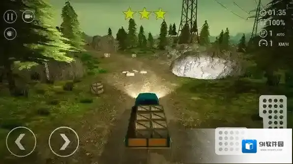 2、用右侧虚拟按键控速,避障碍(石头/木箱),沿山路行驶,保三星,赶时间(01:35)。