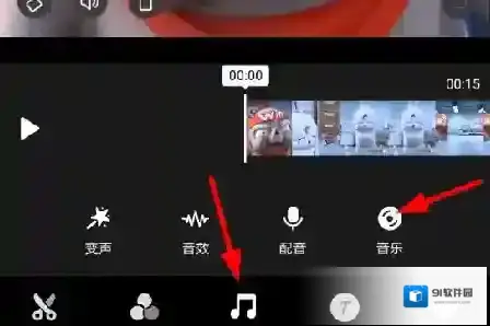 2、接下来我们就可以对添加的视频进行编辑了,通过点击底端的音乐按钮打开音乐便捷功能列表,在列表中我们选择音乐功能即可添加配乐了。