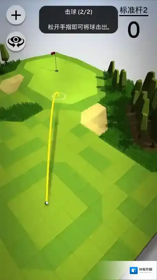 2、击球操作在高尔夫球场,拖动控制击球轨迹(黄色线),松开手指击球,完成击球2/2等步骤,让球进洞。