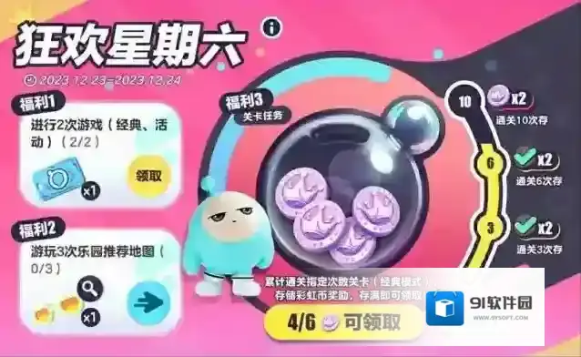 3、参加狂欢星期六活动:每周完成任务会固定获得6个彩虹币。