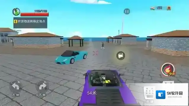2、驾驶紫色汽车,按箭头指引前往指定地点,注意避让,准时送达货物。