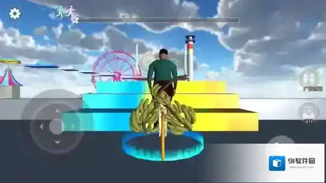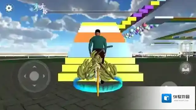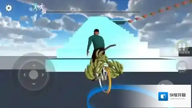 1、操控自行车,沿箭头方向骑行上彩色阶梯,保持平衡,避免香蕉掉落。