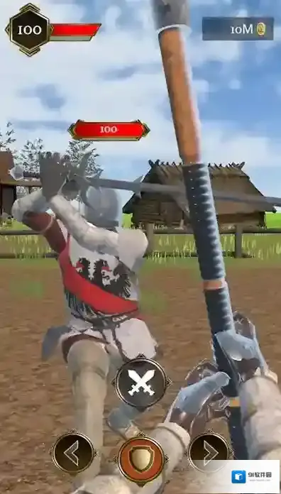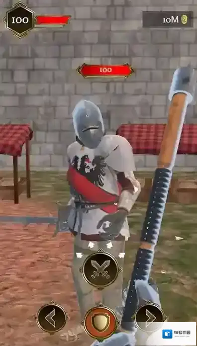 2、画面中显示两名身着盔甲的骑士在对战,上方显示双方血量均为100,下方有操作按钮,包括攻击(交叉剑图标)、盾牌防御(盾牌图标)以及方向移动按钮。