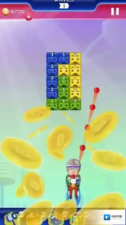 3、上方显示波数、金币数量,画面中有彩色的方块,玩家操控穿着类似宇航服、骑着火箭道具的角色,下方有各种功能按钮,可能是用于辅助消除或增强效果。