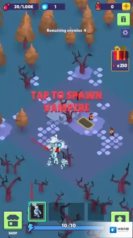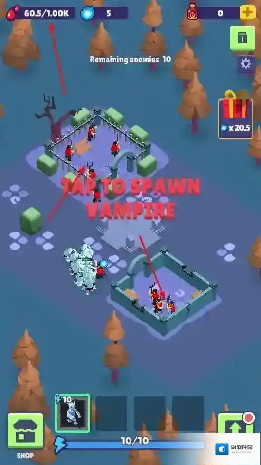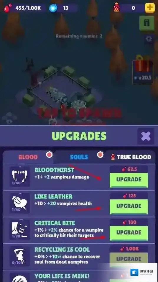 1、点击“TAP TO SPAWN VAMPIRE”,消耗资源召唤吸血鬼单位,投入战场对抗敌人,是基础战斗操作。