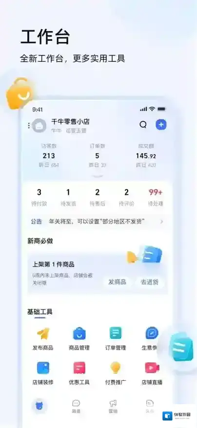 1、提供店铺关键数据,以及任务、交易、商品等常用操作入口。
