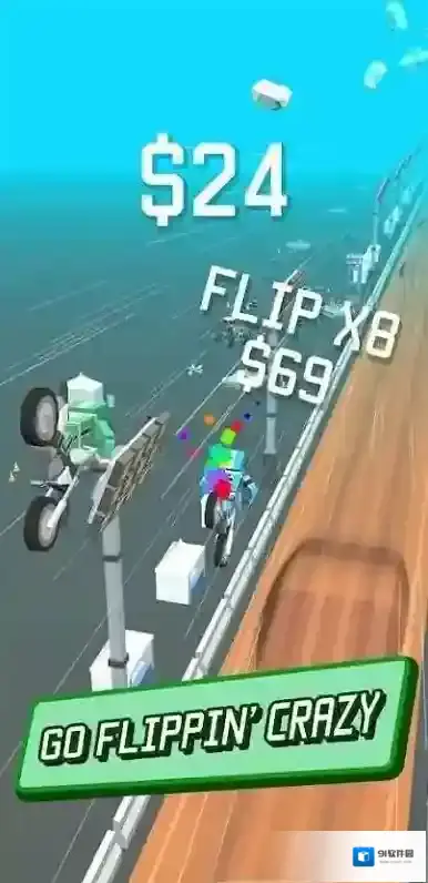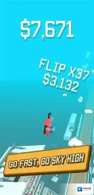 3、竞速中遇到“HOLD TO FLIP!”标识,长按触发空翻特技,在空中翻转时,调整长按时长、时机,精准落地保持速度,利用特技跨越障碍、拉开差距,在完成特技的同时冲刺终点。