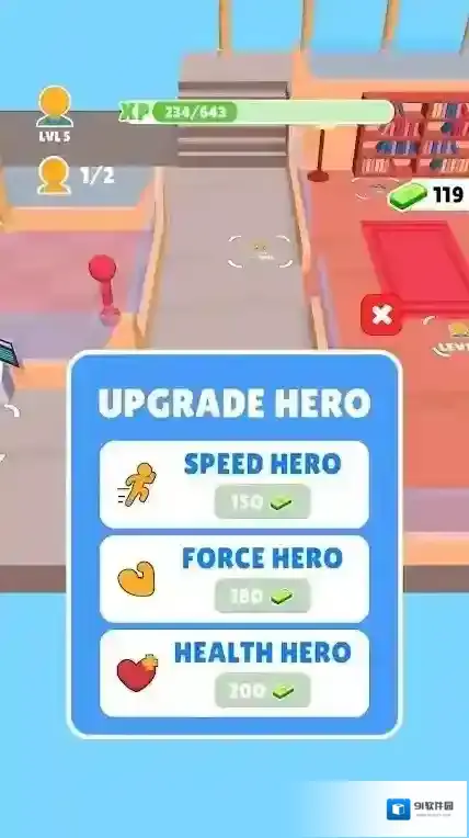 2、界面显示“UPGRADEHERO”(升级英雄)选项,可对英雄的“SPEEDHERO”、“FORCEHERO”、“HEALTHHERO”进行升级。