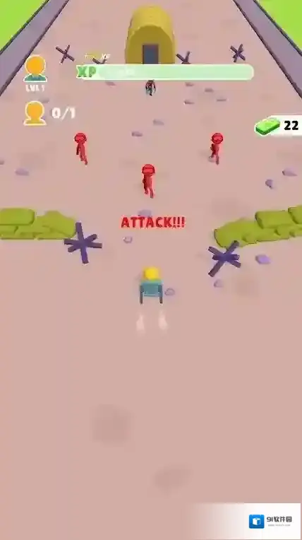1、玩家操控的角色可能需要攻击红色小人,画面有等级、经验值、收集数量、金币数量等信息,文字“ATTACK!!!”提示进行攻击。