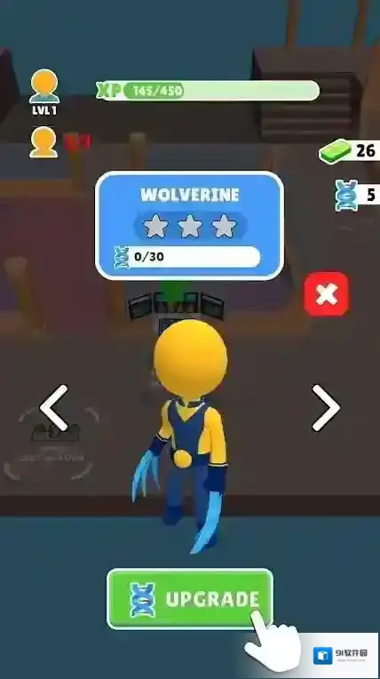 3、显示的角色是金刚狼(WOLVERINE),有星级评价(三颗星),升级需要30个某种道具,下方有“UPGRADE”(升级)按钮。