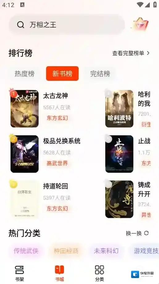 1、书城页面为用户推进热门小说榜单,用户可以及时发现好看的小说。