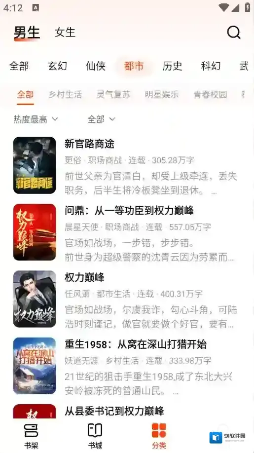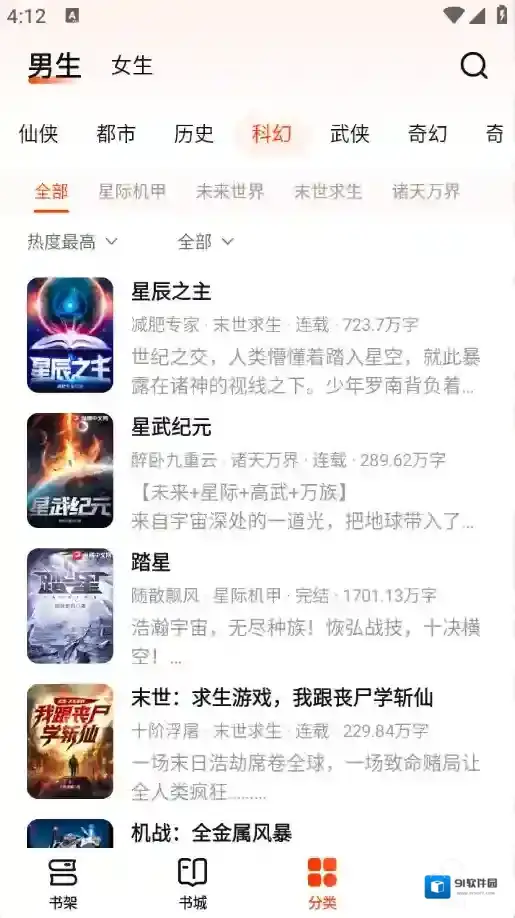 2、分类页面将小说进行了详细的归类,玄幻、都市以及科幻等类型都有。