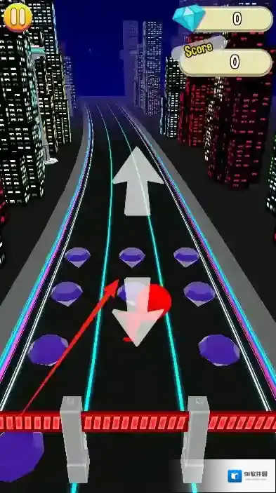 2、中期赛道出现颜色随机变换的动态障碍物,迅速点击颜色按钮切换至黄色,侧身躲过紫色障碍,顺势收集路径上的金色钻石。