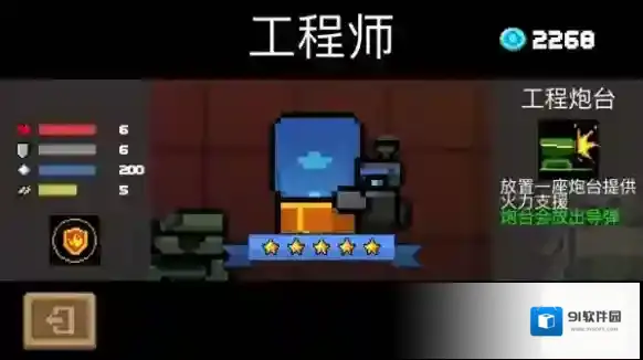 技能1:工程炮台:放置一座炮台提供火力支援。满级后炮台能放出导弹。