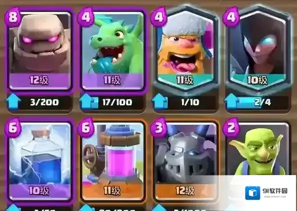 5、到了6阶就可以解锁史诗卡牌了,这时你的对手也会变强,可以尝试吧哥布林牢笼换成骷髅军团,之后就是一直打新的竞技场来解锁卡牌,可以选择冰雪精灵、闪电法术、吹箭哥布林等比较强力的卡牌。