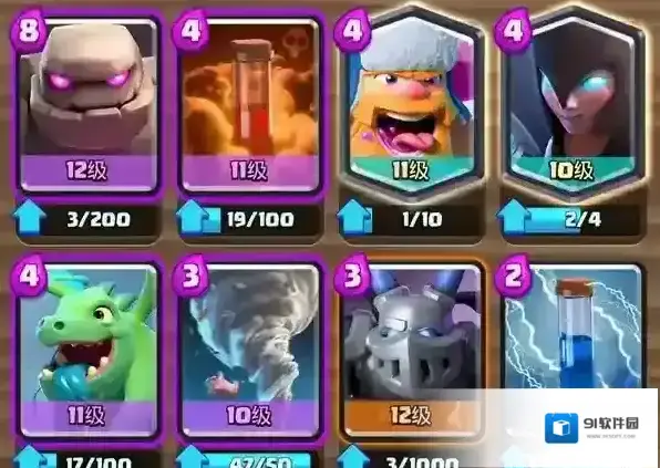 卡组:飞龙+巨人+骑士+火球+万箭齐发+弓箭手+炸弹人+哥布林投矛手。