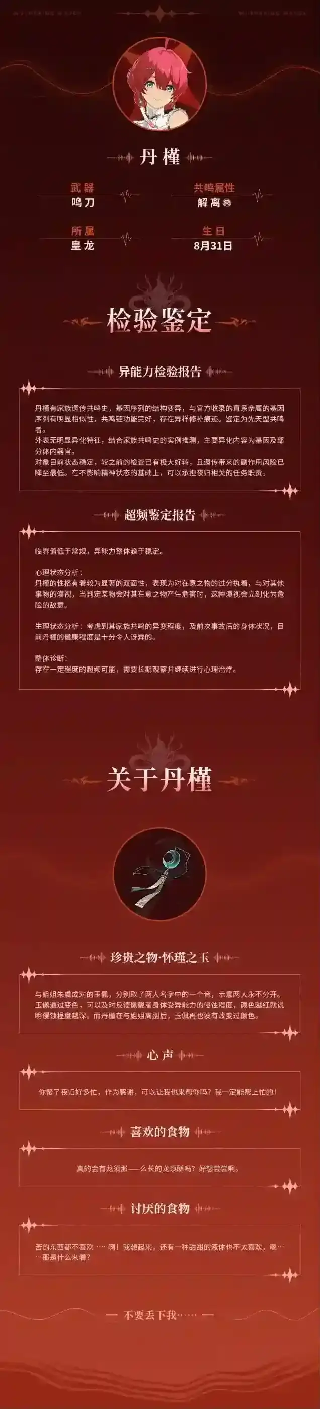 鸣潮档案公开 | 绯花掠影--丹槿 资料加载中 ✦夜归--丹槿✦夜归成员之一,对亲情的渴求近乎偏执。若有人胆敢伤害她的“家人”,即便拼尽全力也绝不姑息。2025-09-02 -