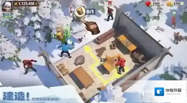 3、切换建造模式,点击红箭头指向资源(木材+5),收集后修复家园,招募居民,提升实力。