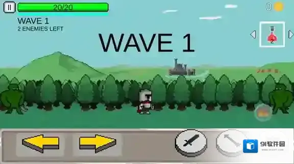 2、进入关卡后点击左侧的按钮控制角色移动,右侧的按钮是使用长剑、弓箭、防御。