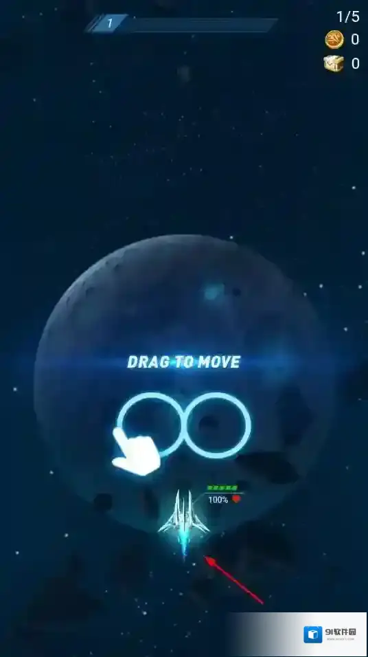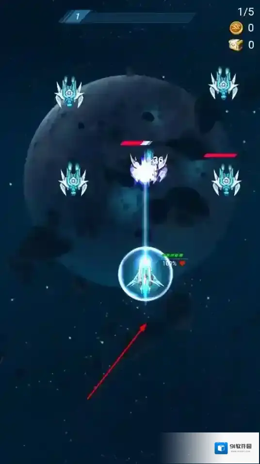 1、进入游戏后,在战机选择界面挑选心仪战机,滑动屏幕操控战机在初始太空场景中移动,点击射击按钮对迎面而来的敌人发动攻击。