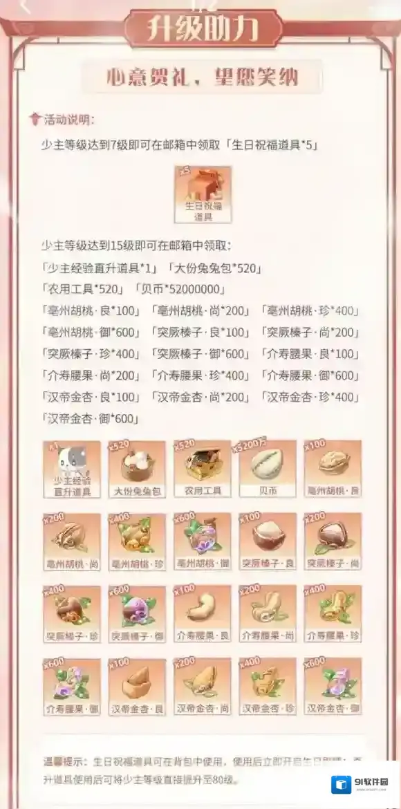 2、为玩家提供了升级助力,玩家等级达到7级即可在邮箱中领取「生日祝福道具*5」,等级达到15级即可在邮箱中领取大量升级道具。