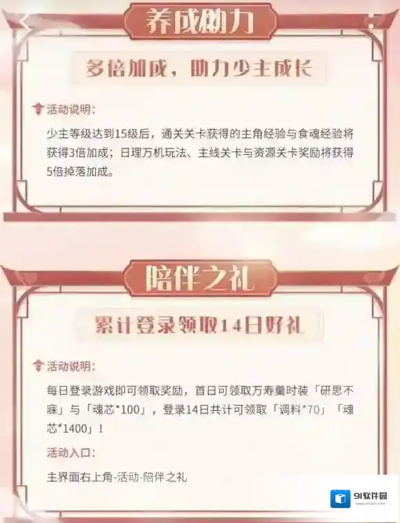 4、游戏养成难度降低,为玩家提供多倍材料掉落的养成助力,首日登录送万寿羹时装「研思不寐」,累计登录14天免费赠送1400抽。