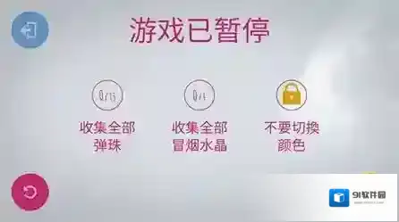 5、在游戏过程中,尽量收集全部冒烟的水晶和弹珠,如需暂停或退出当前游戏,可以点击暂停按钮或左上角的退出按钮。
