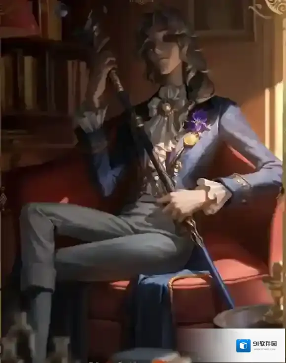 长款风衣与围巾都有着精美的暗纹,黑色手套与风衣袖管之间露出了他透明的手腕。合身的西装裤包裹着他细长的双腿,小腿处的绷带末端散开自然垂落,谁也看不到他的双脚。他的手中拿着一个独特的烧杯支架,似乎在暗示着他的真实身份……