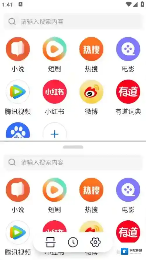 2、进入到首页之后可以看到上下两个分屏浏览器,在输入框中输入关键词或者网址点击搜索。