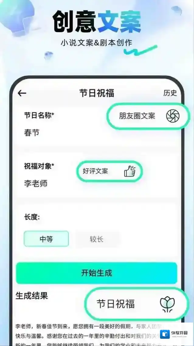 1、进入app之后,点击“全文生成”,可以快速快速生成你想要的模版。