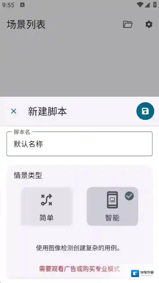 4、选择好情景类型后,为脚本设置一个名称,然后点击右上角的“保存”按钮。