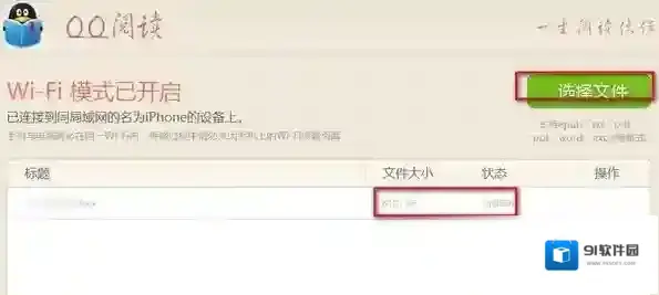 然后,浏览器会进入到QQ阅读Wi-FI模式传书界面,点击右侧“选怎文件”摁钮选中你需要上传的文件就可以立即将你的小说和相关文档长传至QQ阅读浏览。