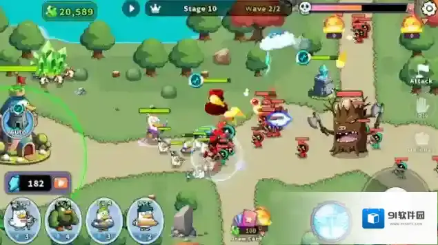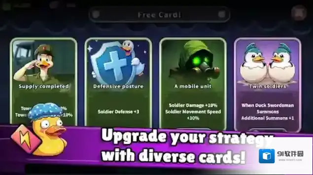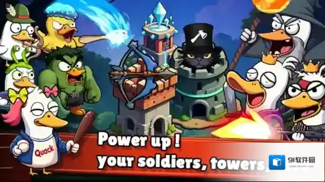 1、自由搭配各种类型的鸭子士兵,并召唤强大的英雄鸭,建造不同功能的防御塔,击败所有入侵的敌人。