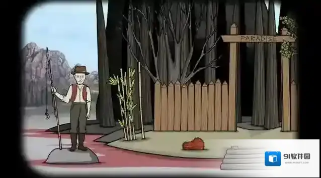 4、进入天堂岛内部之后,在不远处发现了一个老奶奶,点击老奶奶鼻子可以找到一个水蛭,视角向右,往森林深处走,来到一处房子内部,看到有个穿着得体的男人正在用餐,而我们钓上来的虾给了他享用,我们用弯刀把虾砍断,拿到第二只水蛭。