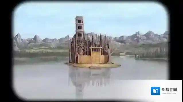 8、来到锈湖后,查看左边的血水,点击一下会从水里冒起来一口棺材,我们将周围钉子全部拿掉后拿到一个黑色方块。完成之后我们把黑色方块放入右边建筑物里的吊饰中,第一关结束。