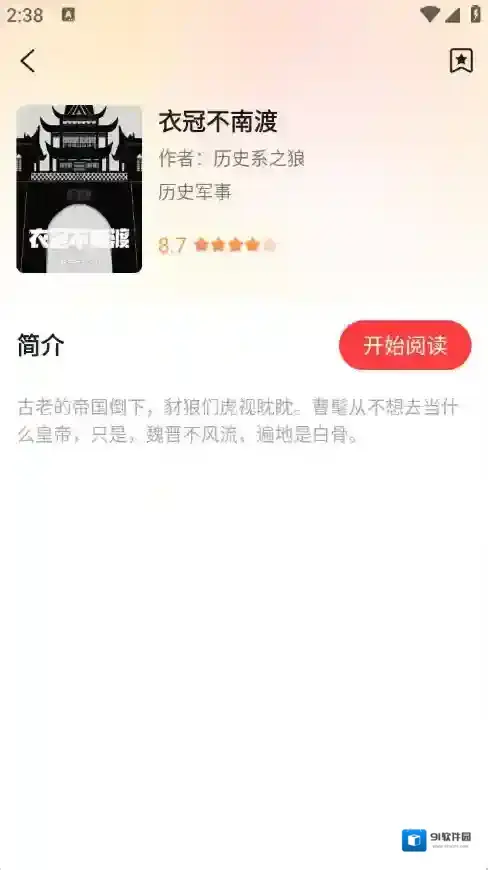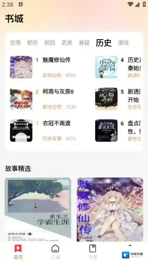 2、首页有很多的小说类型,言情、悬疑以及历史等类型。