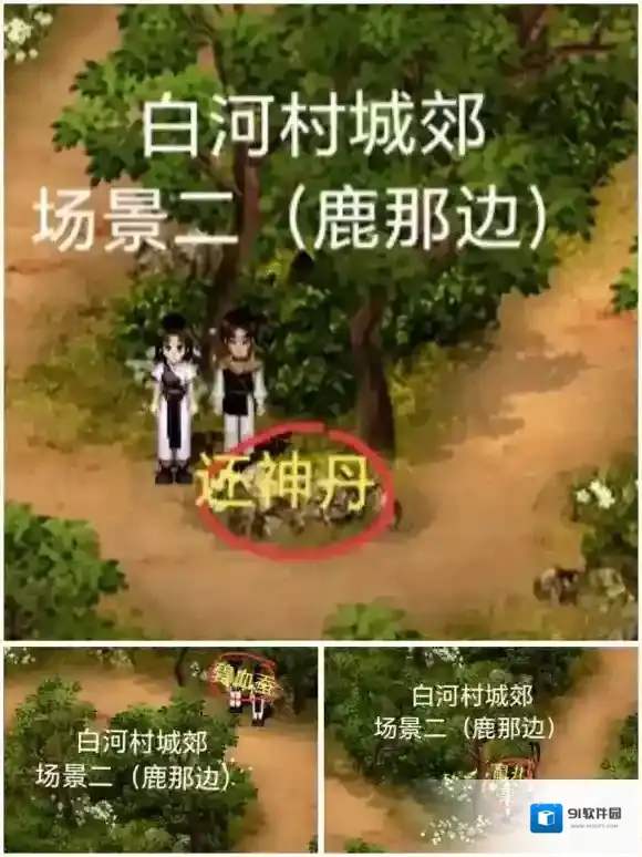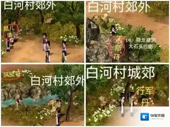 沿路走见到女孩儿们,他们感谢逍遥和月如,请二人去白河村奉茶。逍遥感到无心插柳,群人走后小狐狸窜出来咬了逍遥一口逃走了(支线剧情),月如说后面一定要找个大夫给看一看,沿路来到(地图右下)白河村。