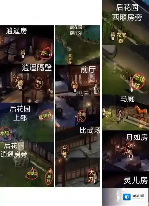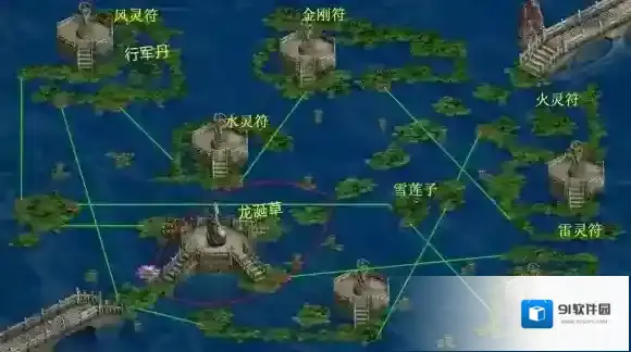 我的走法:先去拿土灵符然后敲碎第一个石像,返回,再去拿雪莲子,然后去拿风灵符和行军丹(荷花里面)并敲碎第二个石像,拿水灵符敲碎第三个石像,拿金刚符敲碎第四个石像,拿火灵符与雷灵符敲碎第五个石像,最后敲碎第六个石像(图中最下面,中间那个),返回主路坐荷花过去,记得回头去拿龙涎草。