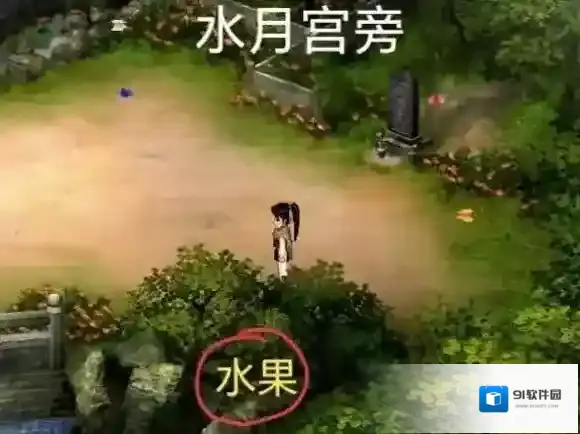 直走触发剧情,灵儿要我们赶快进去取药。剧情结束先把水月宫大门左边宝箱拿了,然后去右面的树下拿隐藏物品-水果。然后进入水月宫