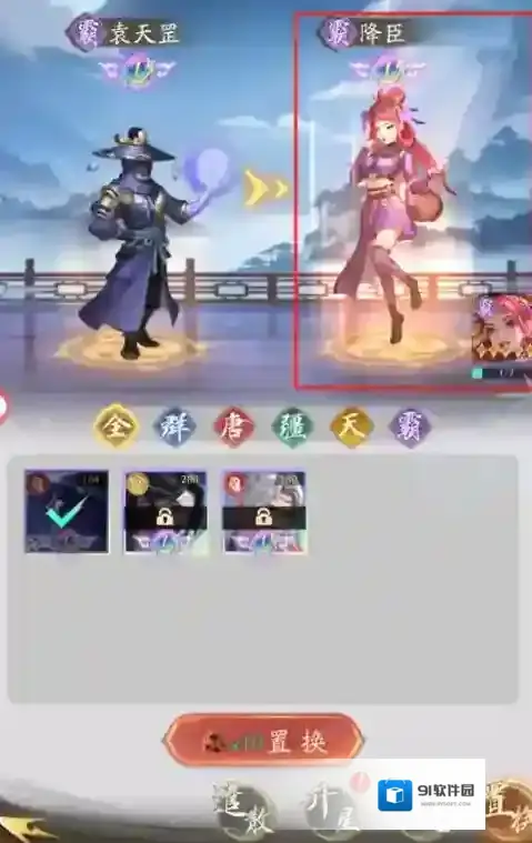 2、当侠客星升到达登封1阶之后,就可以通过置换的方式来换成所需要的侠客,当然置换只能置换相对阵营的侠客,比如群、唐、疆三个阵营可以互相置换,天、霸阵营可以相互置换,并且置换的对象必须要有7张本体卡才可以满足置换的条件。