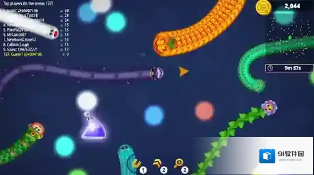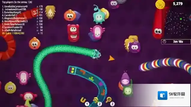 2、操控蠕虫寻找食物,靠近即可食用,增加自己的长度。