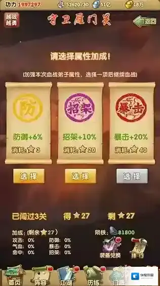 4、若某一关卡无法三星通关,切勿重复挑战,此时应去培养弟子或提升装备功力,之后再回来挑战。