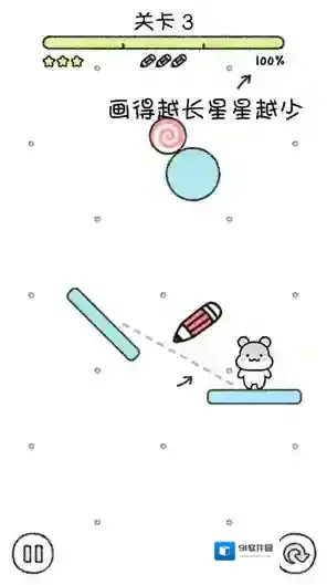 2、进入关卡后玩家需要画线让仓鼠得到糖果,每关可以画线的次数和长度都是有限的。