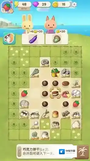 2、点击菜篮子来获得合并素材,将相同的水果或者蔬菜合并来获得更高等级的物品。